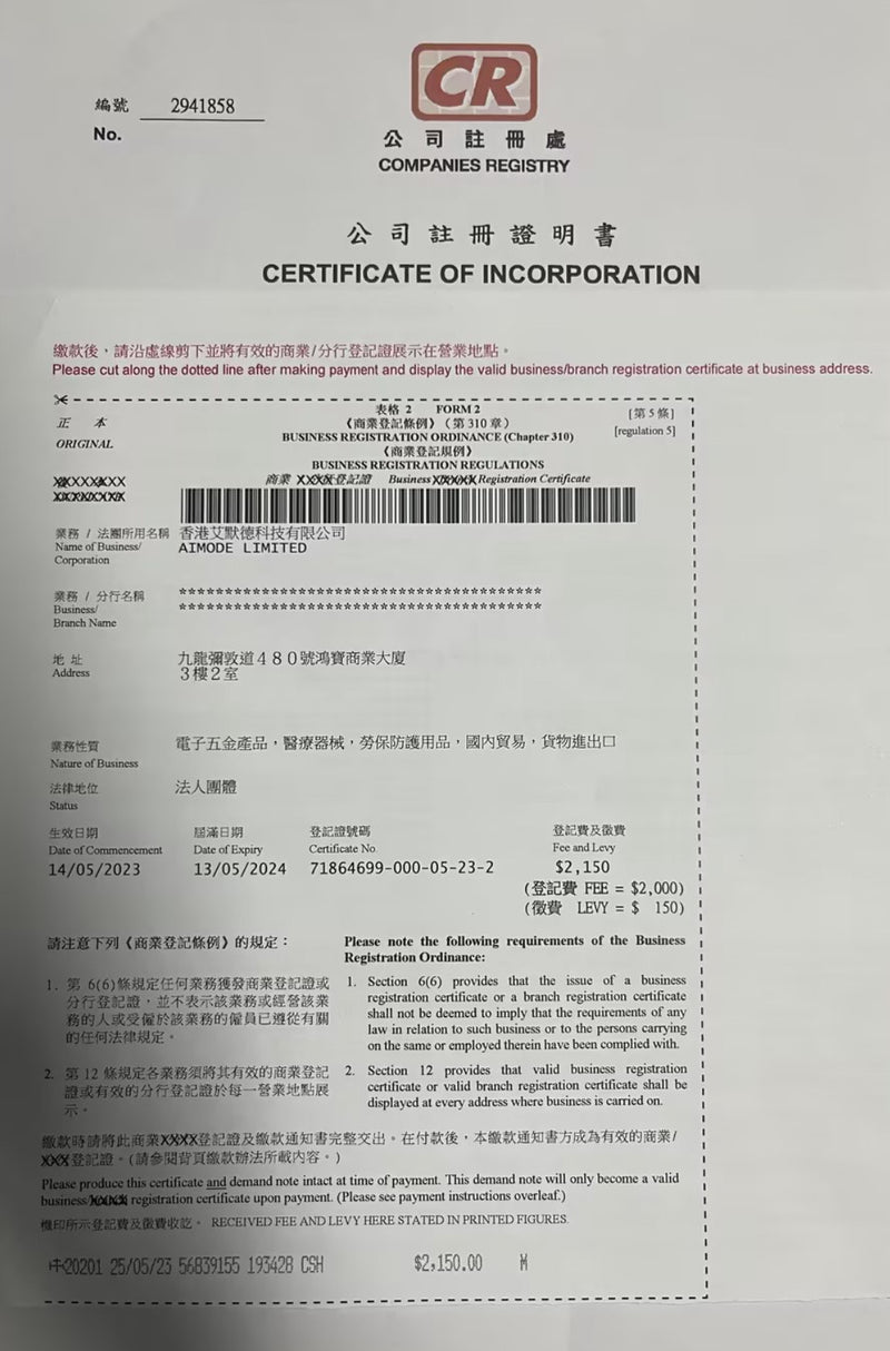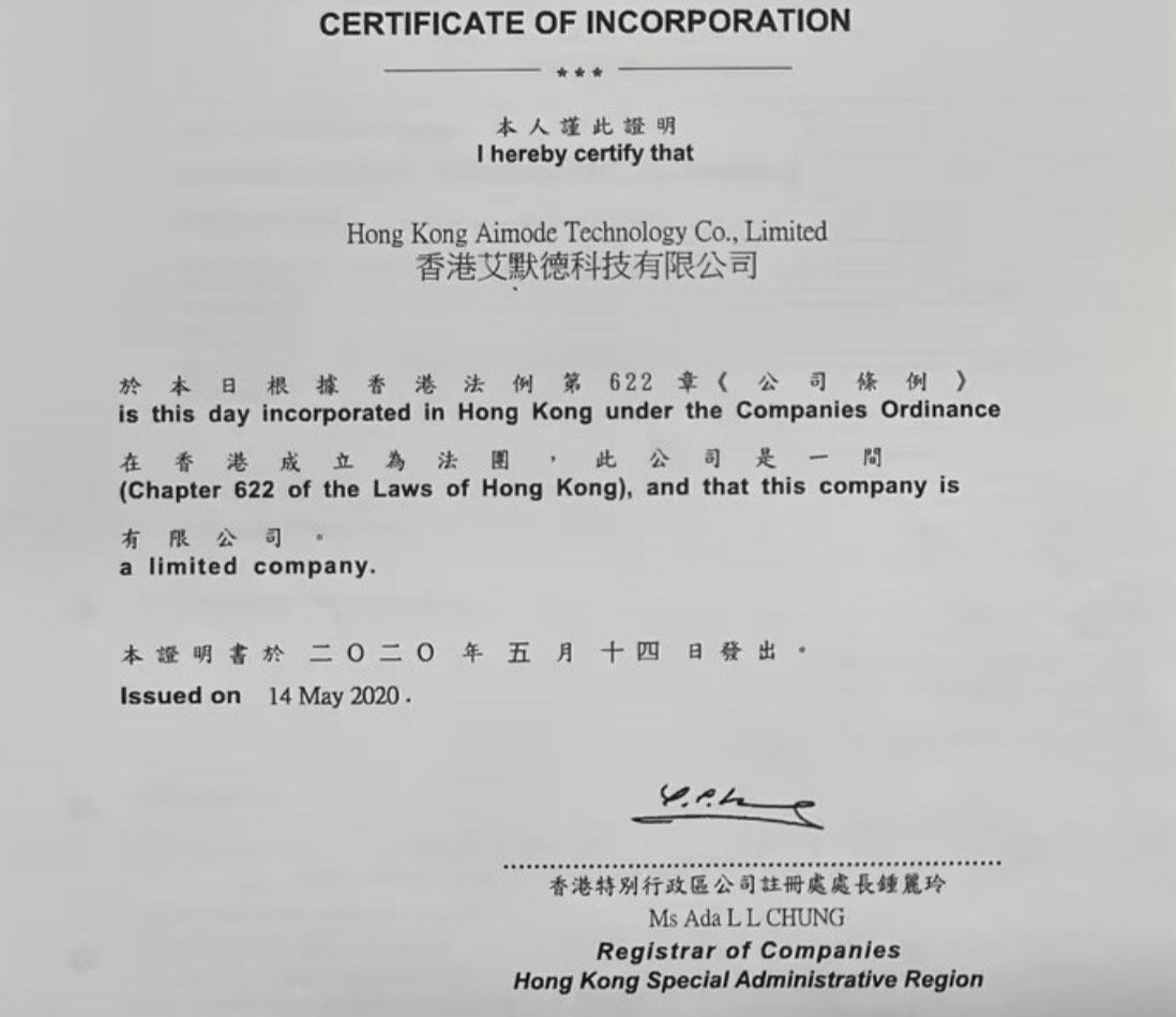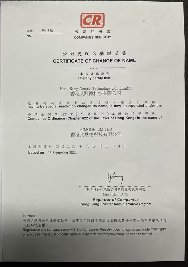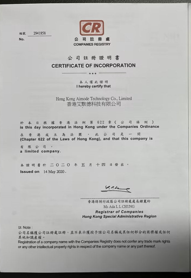 Hong Kong Aimode Technology Co., Limited (香港艾默德科技有限公司)Company Number: 2941858