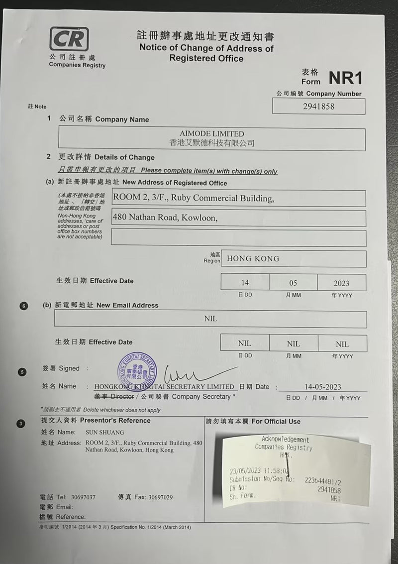 This document is an official Form NR1 – Notice of Change of Address of Registered Office, issued by the Hong Kong Companies Registry. It records and confirms the company’s legal registered office address. This certificate verifies that AIMODE LIMITED has officially updated and registered its current operating address with the Hong Kong government.